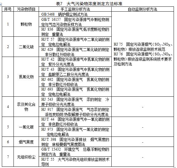 5.1.6 對大氣污染物排放濃度的測定采用表7列的方法標準。