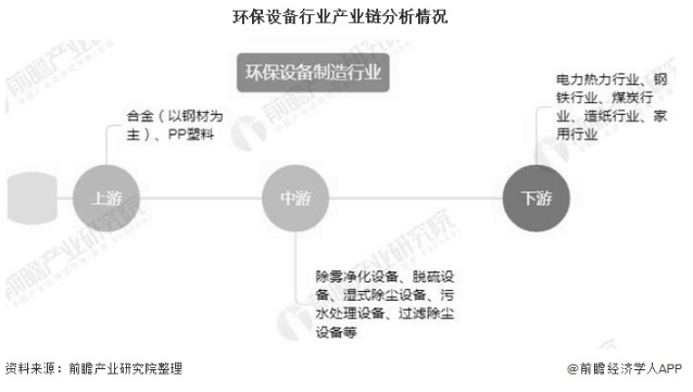 中國環保產業鏈的結構,主要包括上游市場即工業“三廢”的排放,以及在生活中產生的廢品,廢水等。環保設備制造是中國環保產業鏈中的重要組成部分,其上游主要是生產設備所需的鋼材、有色金屬、PP塑料等原材料,下游主要包括電力熱力行業、鋼鐵、煤炭行業、造紙行業等。