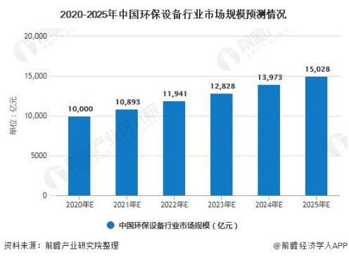 預計2020年,環保裝備制造業市場規模將達到10000億元,2025年市場規模將達到15028億元。