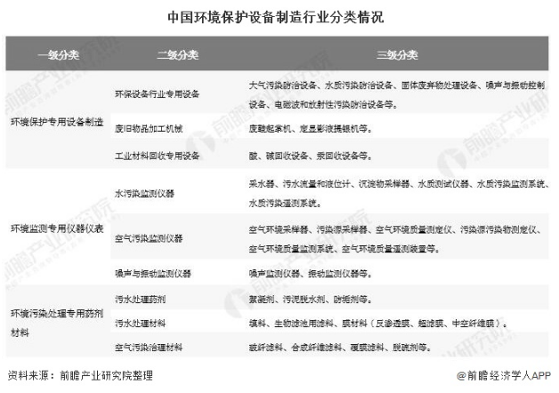 中國環境保護設備制造行業可以分為3類,即環境保護專用設備制造、環境監測專用儀器儀表、環境污染處理專用藥劑材料。