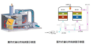 國內外工程化應用的VOCs廢氣催化燃燒工藝主要有:蓄熱式催化燃燒、熱回收式催化燃燒、直燃式催化燃燒、吸附濃縮-催化燃燒四類。